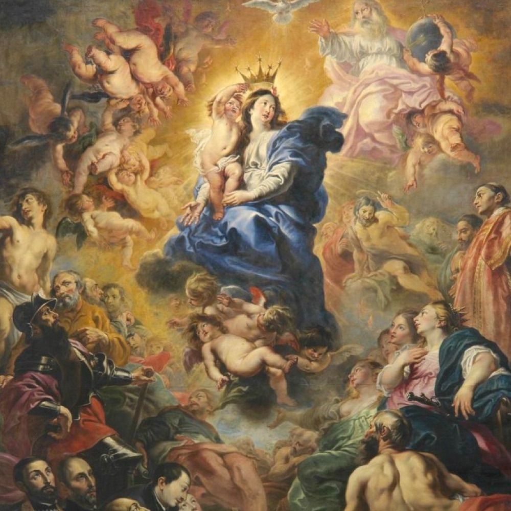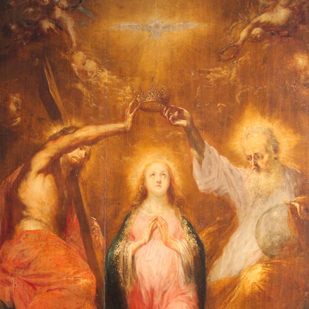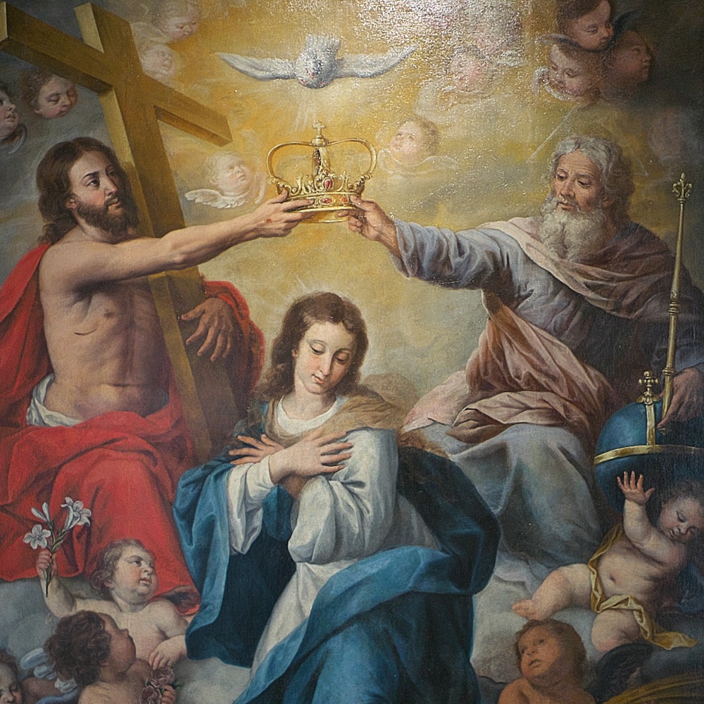 As Mary enters heaven, the entire court of heaven greets with joy this masterpiece of God’s creation. Mary is crowned by her divine Son as Queen of heaven and earth. More than we can ever know the Hearts of Jesus and Mary overflow with joy at this reunion. Only in heaven will we know the great majesty of that coronation, and the joy it gave to the angels and saints. Even the angels, who by nature are greater than humans, hail Mary as their Queen. Mary shares so fully in the glory of Christ because she shared so fully in His suffering. Only in heaven will we see how central is the role of Mary in the divine plan of redemption. The angels and saints longed for the coming of her whose heel crushes the head of the serpent. Mary pleads our cause as a most powerful Queen and a most merciful and loving Mother. A great sign appeared in heaven; a woman clothed with the sun, the moon under her feet, and on her head a crown of twelve stars.
